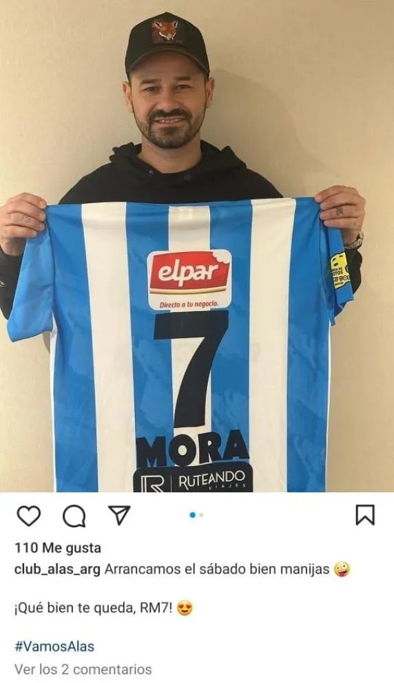 “Miren lo que me acaba de llegar… me encantó!”, escribió, etiquetando a su nuevo club barilochense y agregando algunos emojis a la historia. Mientras que desde Alas Argentinas hicieron lo propio, compartiendo dos fotografías de Mora con la camiseta en sus manos.