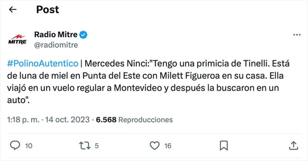 El programa de radio de Marcelo Polino fue el escenario en el que se revelaron todos los detalles sobre la relación. Según los comentarios vertidos en el programa, Tinelli y Milett Figueroa se encuentran en la mansión que posee el periodista en Punta del Este, disfrutando de su luna de miel. Figueroa habría llegado a Uruguay en un vuelo regular, para luego ser recogida por Tinelli en un automóvil.
