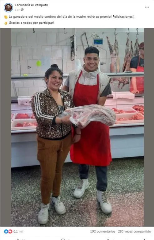 La carnicería El Vasquito de Carmen de Patagones sorteó medio cordero para el Día de la Madre. Cuando la ganadora fue a buscar su premio se tomó una foto junto al carnicero y luego esta imagen se compartió en las redes oficiales del comercio.