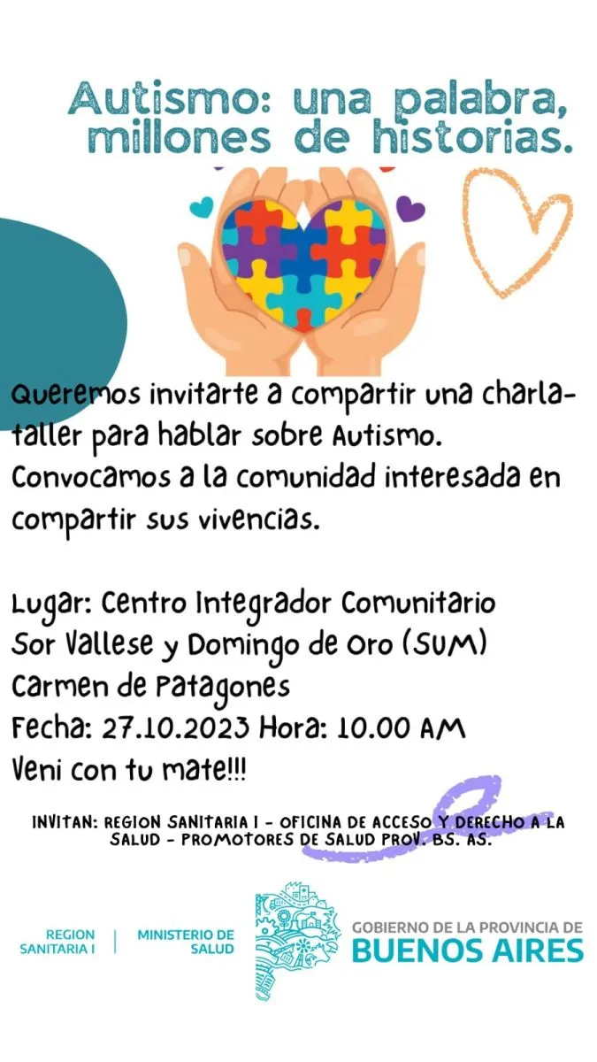 Con respecto a la charla, desde la Dirección de la Oficina de Acceso y Derecho a la Salud informaron que “se trata de una charla -taller sobre autismo que vamos a dar en conjunto con promotores de salud de la provincia de Buenos Aires y Región Sanitaria”.