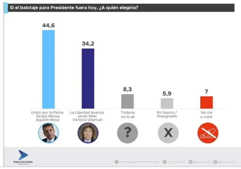 El estudio, realizado por la consultora Proyección Consultores, quien ya había acertado en pronosticar el primer lugar en las elecciones del pasado domingo, muestra una amplia ventaja de Massa con un 44,6%, mientras que Milei obtendría un 34,2%.