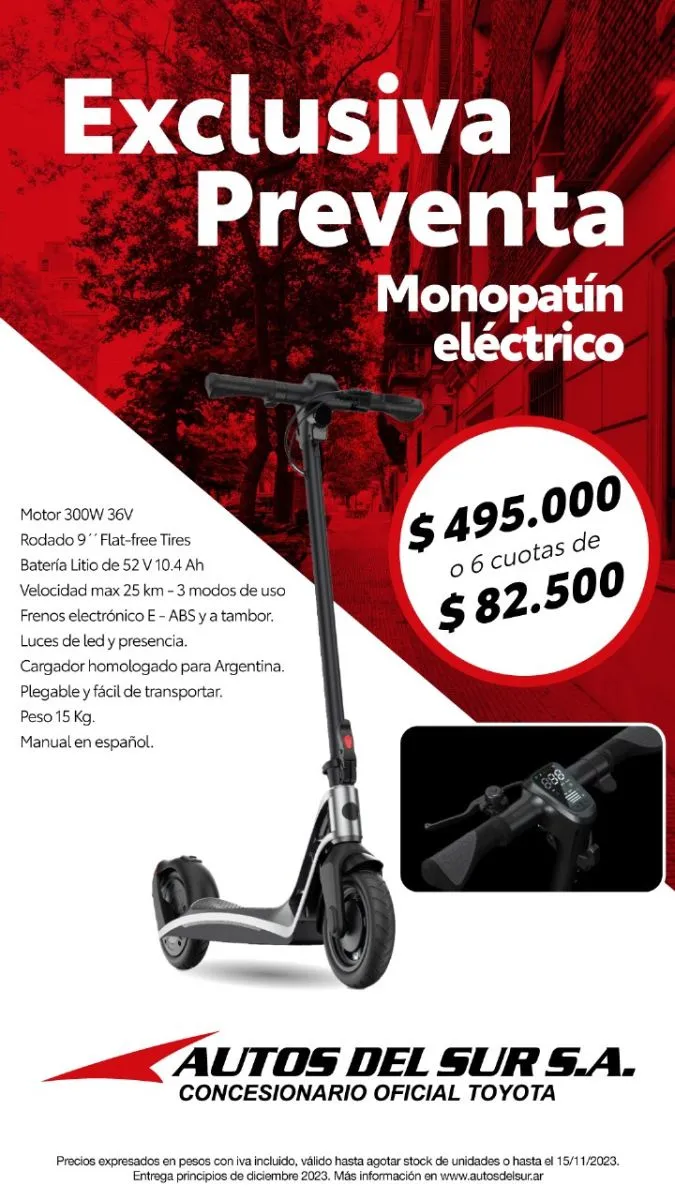 ¿Ya estás pensando en el regalo para navidad? No te pierdas la preventa exclusiva del monopatín eléctrico que ofrece Autos del Sur. Sin dudas un gran regalo para este 25 de diciembre al que podés acceder con un precio promocional de 495000 pesos o en 6 cuotas sin interés de 89500 pesos.