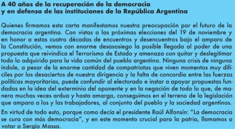 En este contexto, los artistas recuerdan las palabras de Raúl Alfonsín, quien afirmaba que "la democracia se cura con más democracia". Por lo tanto, hacen un llamado al electorado a votar por Sergio Massa en el balotaje, considerando que este es un momento crucial para la patria.
