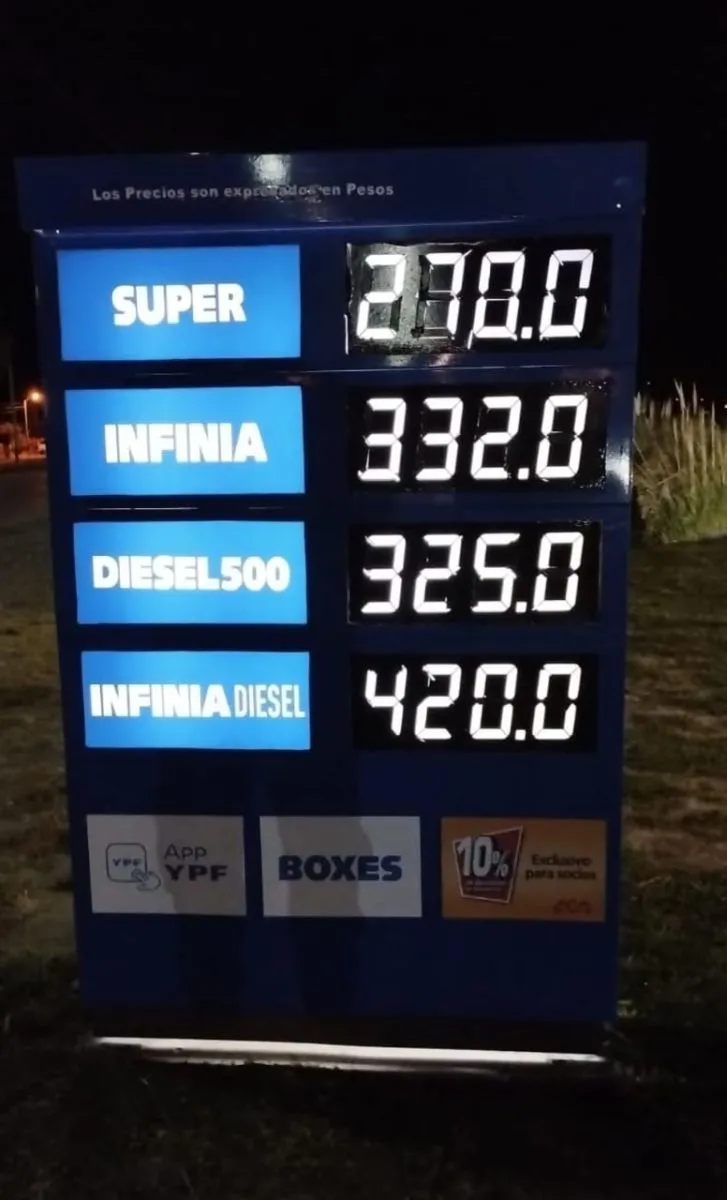 ¿Qué pasó en Viedma? Comenzando por YPF, el mes arrancó con el precio un 9,5 y 9,7 por ciento por encima de lo que costaba días atrás según el combustible. Así las cosas, los precios quedaron de la siguiente manera: súper pasó de 246 a 270 pesos; infinia nafta de 303 a 332; diesel 500 de 296 a 325, infinia diesel de 383 a 420 pesos.