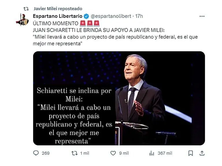 El candidato presidencial por La Libertad Avanza, Javier Milei, compartió un supuesto mensaje de apoyo por parte del gobernador de Córdoba, Juan Schiaretti, de cara al balotaje del 19 de noviembre. Sin embargo, desde Hacemos por el País, espacio político liderado por Schiaretti, desmintieron esta afirmación y negaron cualquier pronunciamiento con respecto a la segunda vuelta.