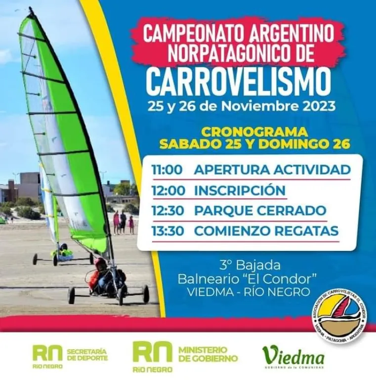 El fin de semana del 25 y 26 de noviembre, se desarrollará en la tercera bajada del balneario El Cóndor el Campeonato Argentino Norpatagónico de Carrovelismo, organizado por la Asociación de Carrovelistas el Cóndor.