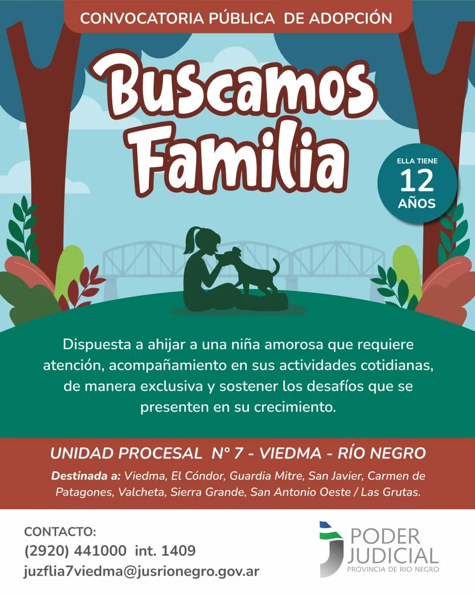 La Unidad Procesal Nº 7 de la Primera Circunscripción Judicial en Viedma, a través del Registro Único de Aspirantes a Guarda con Fines Adoptivos, convoca a familias que quieran vincularse con una niña de 12 años de edad.