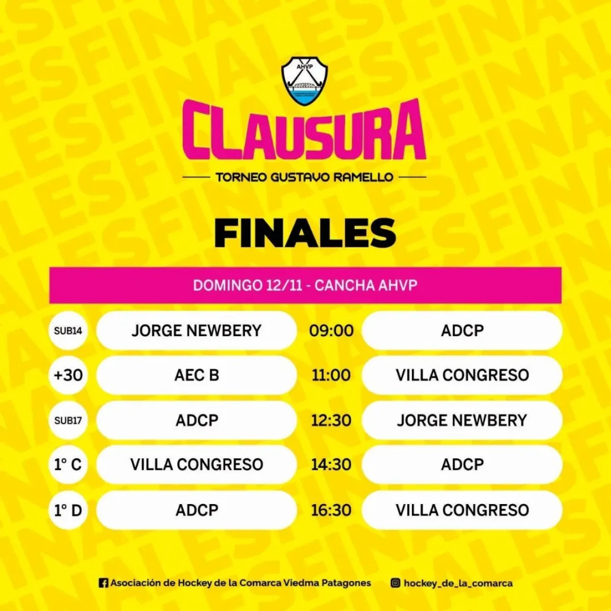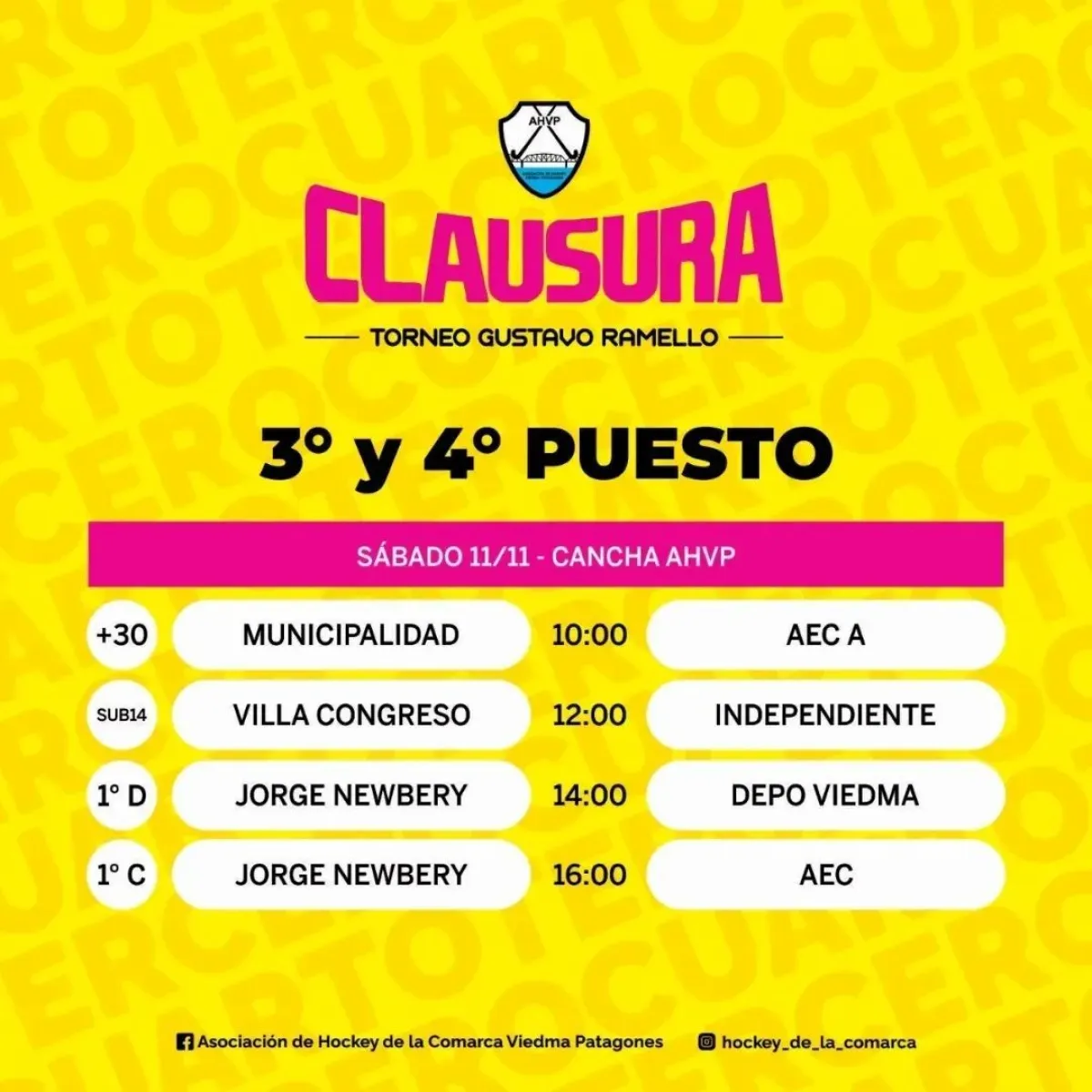 El Torneo Clausura de la Asociación de Hockey de la Comarca Viedma – Patagones llega a su fin este sábado y domingo, en donde se conocerán a los campeones y campeonas de cada categoría. El sábado se disputarán los paridos por el tercer y cuarto puesto, mientras que el domingo se desarrollarán las finales, todas en canchas de la AHVP.