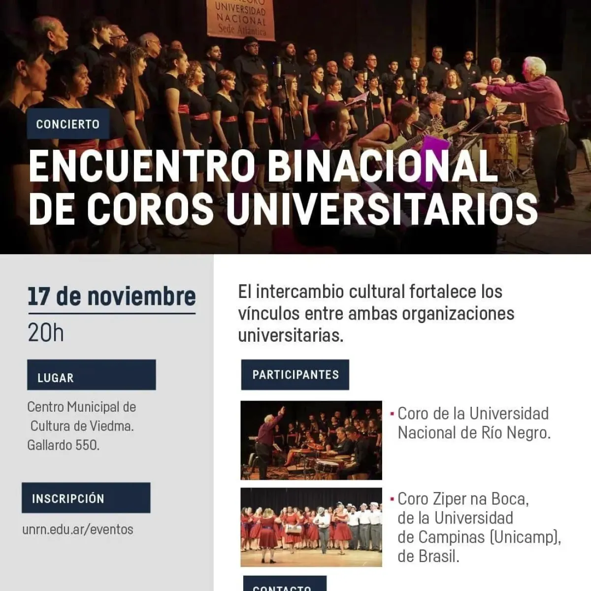 El próximo viernes 17 de noviembre, a las 20 horas, se realizará el Encuentro Binacional de Coros Universitarios en el Centro Municipal de Cultura de Viedma.