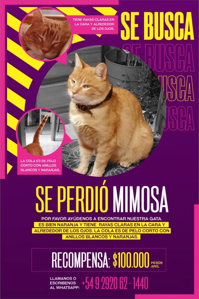 La asociación de Perros Abandonados y Maltratados de Viedma (PAMVI) que siempre colabora con las diferentes problemáticas relacionadas a los integrantes peludos de las familias, publicó un afiche anunciando la búsqueda de Mimosa; una gatita color naranja.