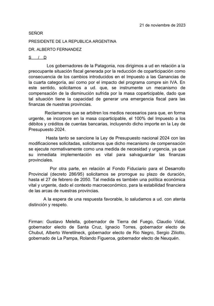 El documento lleva la firma de los gobernadores Alberto Weretilneck, electo de Río Negro; Gustavo Melella, de Tierra del Fuego; Claudio Vidal, gobernador electo de Santa Cruz; Ignacio “Nacho” Torres, electo de Chubut; Sergio Ziliotto, gobernador de La Pampa; y Rolando Figueroa, electo de Neuquén.