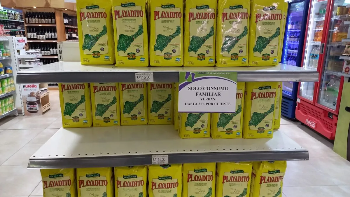 Por otro lado, productos como leche (Tregar a 547 pesos por litro) o yerba (Playadito a 2115 por medio kilo) se exhibieron con leyendas que indican que los productos eran solo para consumo familiar y se podía comprar tres por cliente.