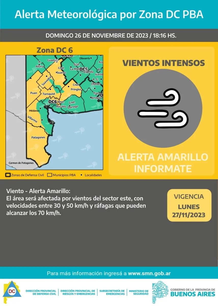 La Dirección de Defensa Civil de la Municipalidad de Patagones recomienda a la comunidad circular con mucha precaución en la ruta Nacional N°3. Debido al temporal de viento, la visibilidad se verá notablemente reducida por polvo en suspensión durante el lunes.