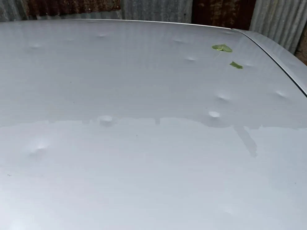 Otro vecino, graficó las consecuencias con un registro en el que se aprecia cómo quedó su vehículo al recibir de lleno los impactos que caían del cielo.