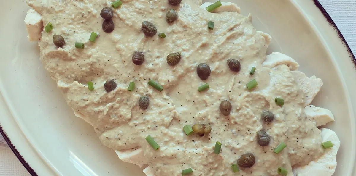 Procesa un par de minutos para que se integren bien los productos. A continuación, prueba la salsa de vitel toné fácil y, si es necesario, rectifica sabores con el condimento que falte según tus gustos. También puedes ajustar la textura y si quedó demasiado espesa, alivia la salsa con el caldo de cocción del pollo. Reserva en heladera.