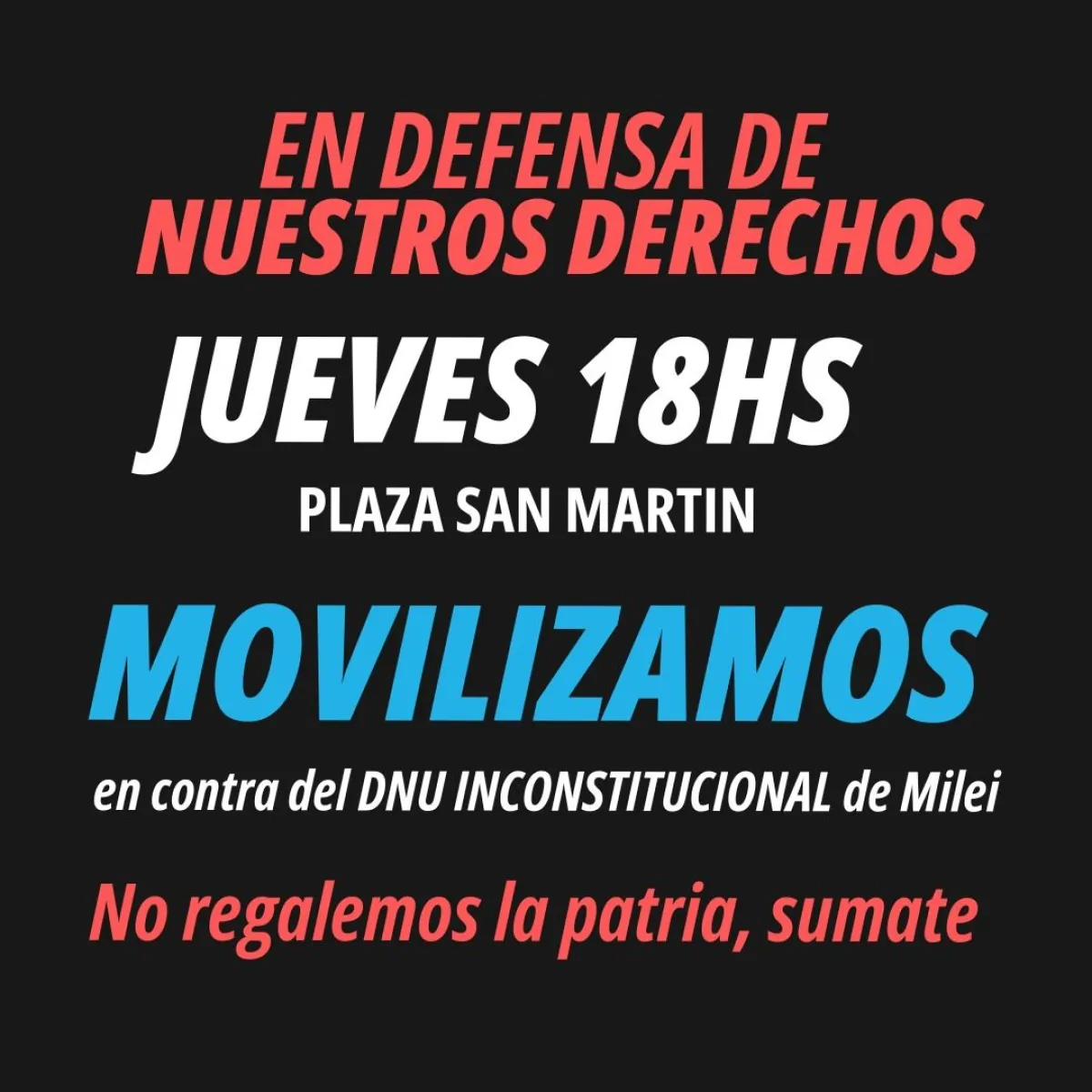 La convocatoria ha comenzado a viralizarse en redes sociales y grupos de whatsapp expresando que en ”respuesta al decretazo de Milei salimos a la calle para defender nuestros derechos y también la división de poderes de la república.