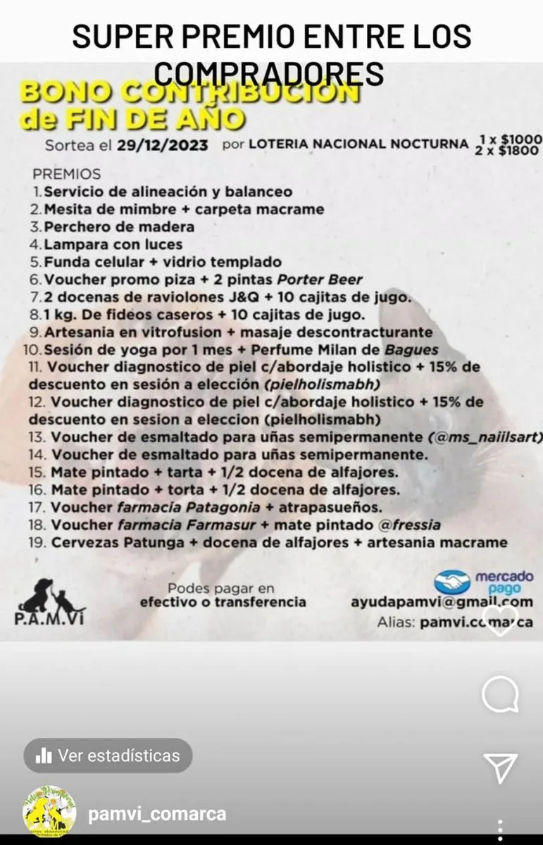 Desde la Asociación de Perros Abandonados y Maltratados de Viedma, lanzaron un bono para fin de año que tiene una variada gama de premios, lo que van de una servicio de alineación y balanceo a una cerveza artesana + doce alfajores + artesanía macramé. Para participar se puede comprar enviando mensajes directos a la redes sociales de PAMVI: PAMVi en Facebook y PAMVI_COMARCA en Instagram.