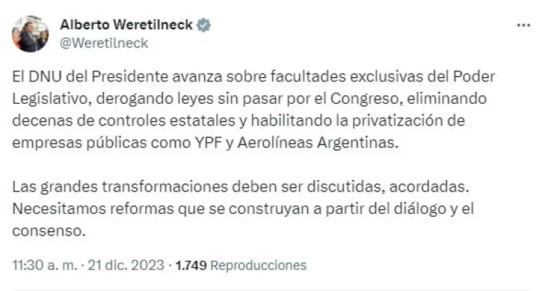 “El DNU del presidente avanza sobre facultades exclusivas del Poder Legislativo, derogando leyes sin pasar por el Congreso, eliminando decenas de controles estatales y habilitando la privatización de empresas públicas como YPF y Aerolíneas Argentinas”, comenzó su texto Weretilneck.