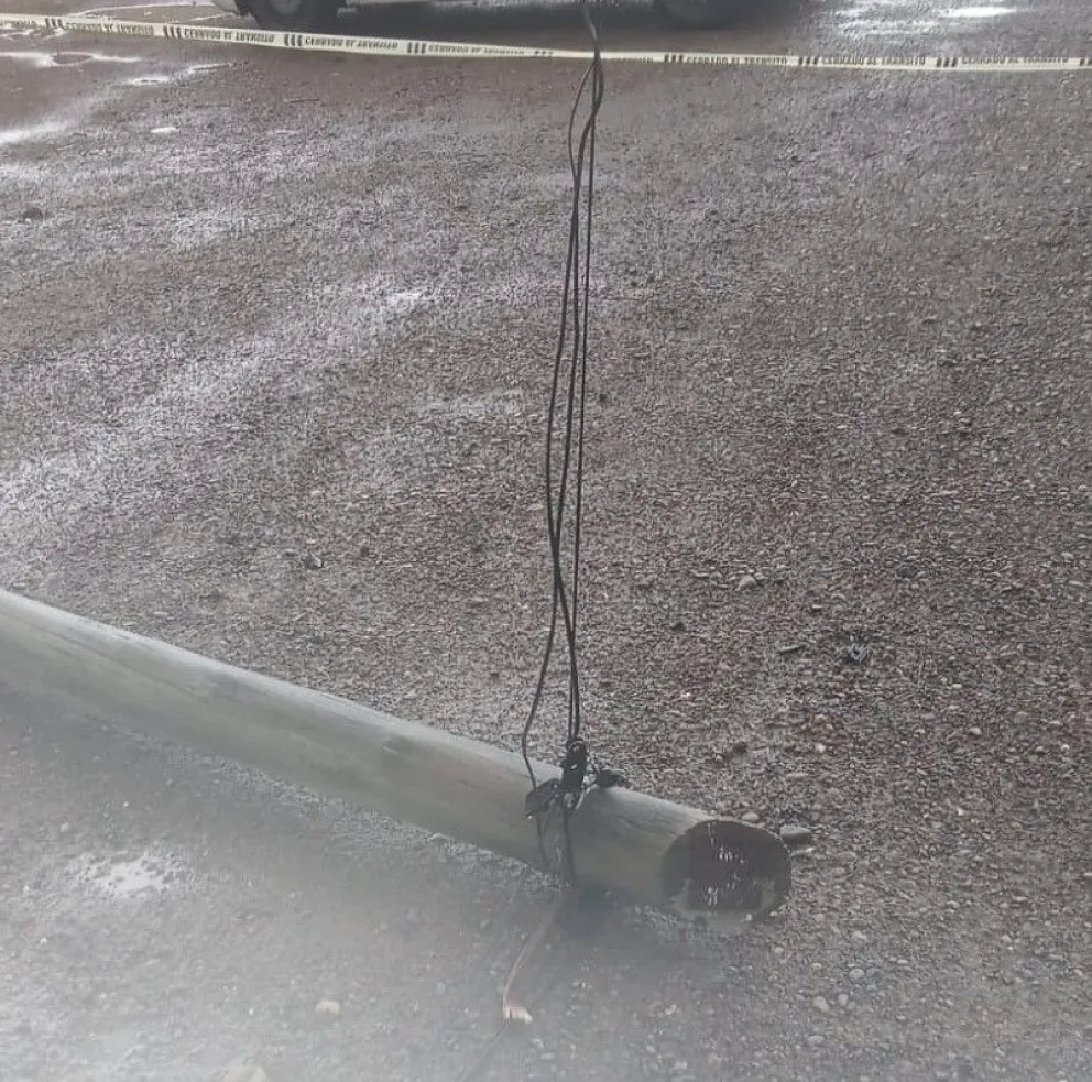 Producto de la fuerte lluvia y algunos vientos registrados en la tarde del miércoles, se cayó un poste de luz en la intersección de las calles Fournier y Paulino Rojas del barrio Villa Lynch, en Carmen de Patagones.
