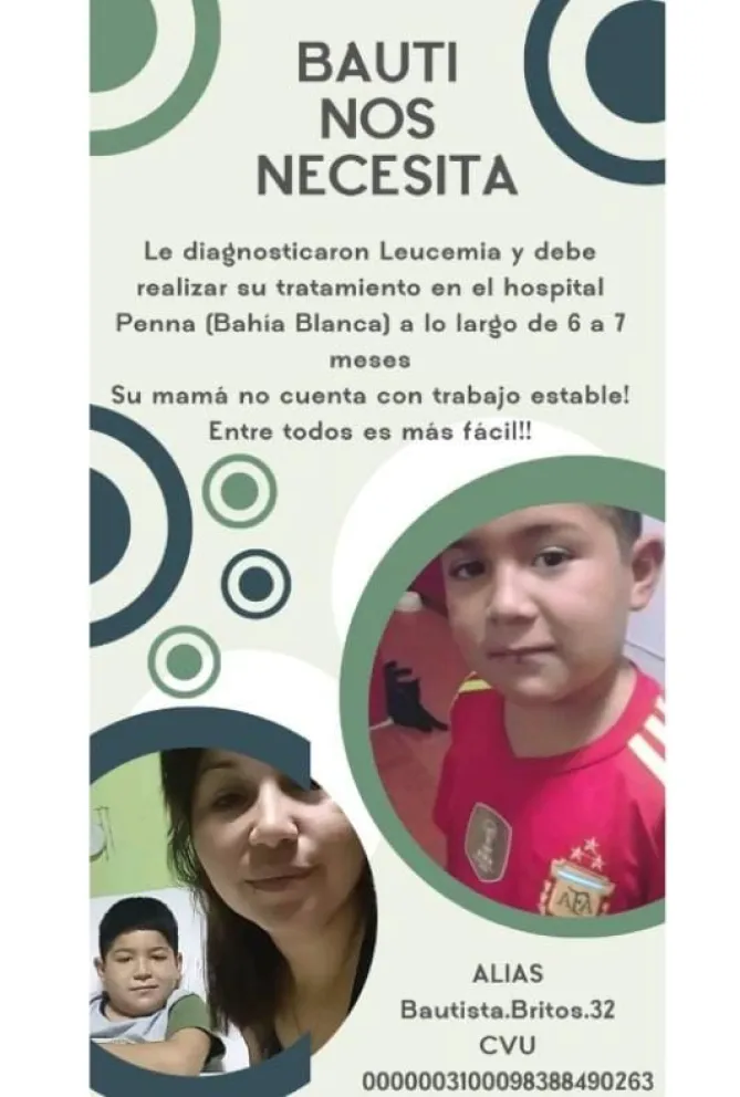 El chico le diagnosticaron leucemia y está llevando adelante un tratamiento en Bahía Blanca. Su mamá es taxista, no está trabajando para cuidarlo a él, y todo se hace cuesta arriba.