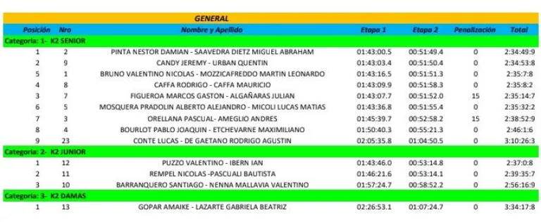 La segunda de las etapas tuvo a la dupla Nicolás Rempel y Bautista Pascual como los vencedores en K2 Junior, mientras que en damas, Amaike Gopar y Gabriela Lazarte lo hicieron en damas. En K2 Máster A, la dupla de Gustavo y Javier Rodríguez dominó la segunda etapa, mientras que Martina Catalano sigue mostrando su excelente nivel en compañía de Emanuel Carnicero al adjudicarse el tramo en K2 Mixto.
