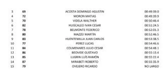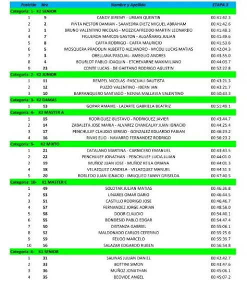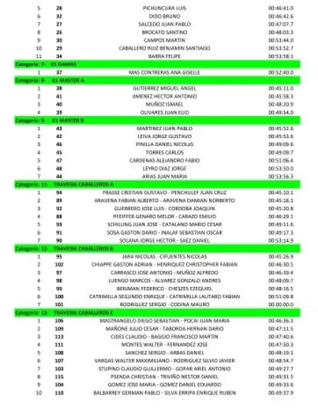 En K1 Máster “C” Julián Solotar marcó el camino y fue seguido por Omar Linares en segundo lugar y Rodrigo Castillo, mientras que en K1 Senior, Julián Salinas marcó la tendencia, seguido por Simón Bottini y Jonathan Muñoz. Ana Mas Contreras registró 52.40,0 al llegar a la meta.