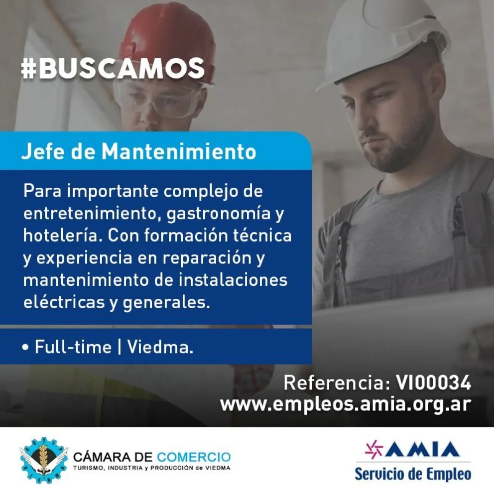 Para importante complejo de entretenimiento, gastronomía y hotelería de Viedma, la Cámara de Comercio de Viedma y el servicio de empleo de AMIA realizaron una convocatoria en la busca a personas que puedan ocupar un puesto vacante como jefe de Mantenimiento. En cuanto a las tareas a realizar, son las de coordinación del equipo de trabajo.