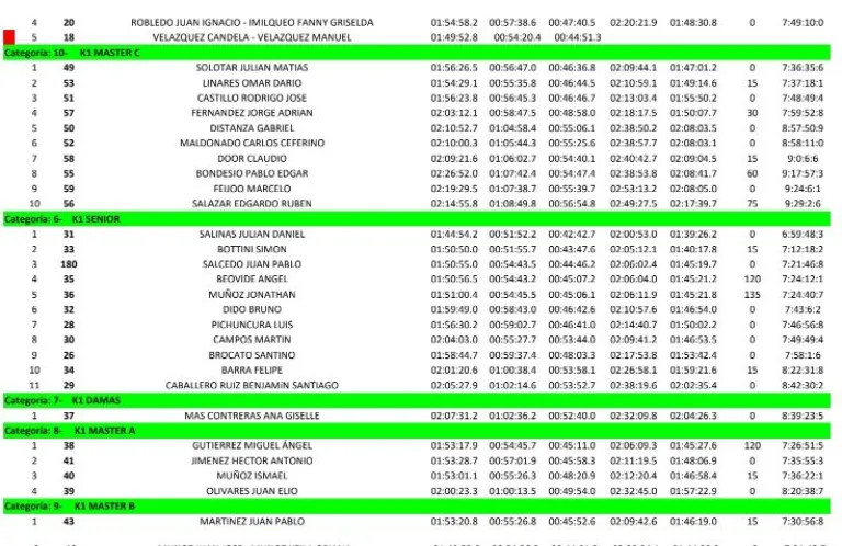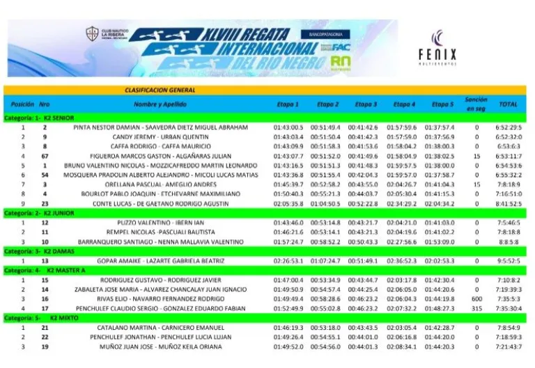La organización de la Regata Internacional del río Negro dio a conocer los resultados oficiales de la quinta etapa del evento, y no solamente en la categoría de los K2 Senior hay una definición ajustada, sino que categoría por categoría, el margen de error es cada vez más ajustado con la mirada puesta en Viedma.