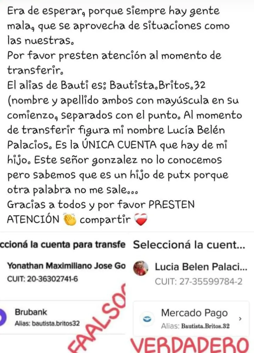 Pero es tanta la gente que está colaborando, que aparecieron los vivos de siempre, con un alias de Mercado Pago muy similar, para confundir y aprovecharse de la situación. Fue Lucía la que alertó a la comunidad sobre el tema, dejando en claro que aquel que quiera ayudar, el alias es:  Bautista.Britos.32