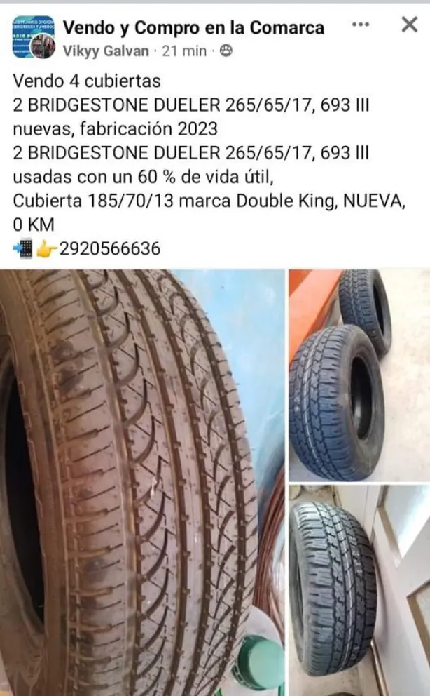 En Vendo y Compro en la Comarca, por ejemplo, días atrás denunciaron que una persona estaba vendiendo cubiertas, según la descripción, algunas nuevas y otras usadas, pero en muy buen estado. El usuario Vickyy Galván, hasta dejó un número de teléfono: 2920-566636. Ante la oferta tentadora, muchos se comunicaron.