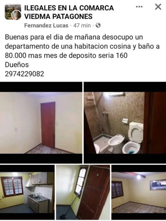 Otro caso que fue detectado por Basta de robos, tiene que ver con un departamento en alquiler. Se trata de una propiedad que existe, que está en alquiler, pero un tal Lucas Fernández, cuyo teléfono de contacto publicado es: 2974229082, se apropió de esas fotos para hacer una publicación paralela en varios grupos de Viedma y Patagones.