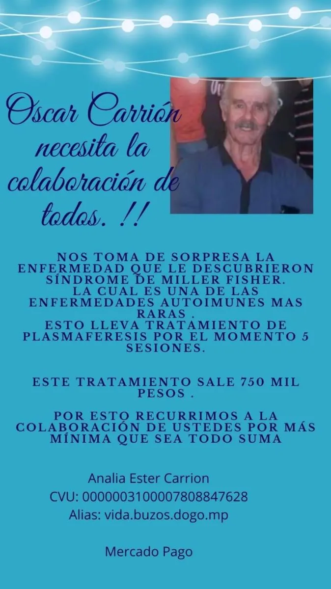 Oscar Carrión, es un vecino de Viedma fue diagnosticado con el síndrome Miller Fisher, una enfermedad autoinmune bastante rara; literalmente se da 1 en un millón de personas. Esta patología provoca que el sistema inmunitario ataque a los nervios del cuerpo provocando diversos trastornos como debilidad de los músculos oculares que causa dificultad para mover los ojos; alteración de la coordinación e inestabilidad de las extremidades y reflejos tendinosos ausentes