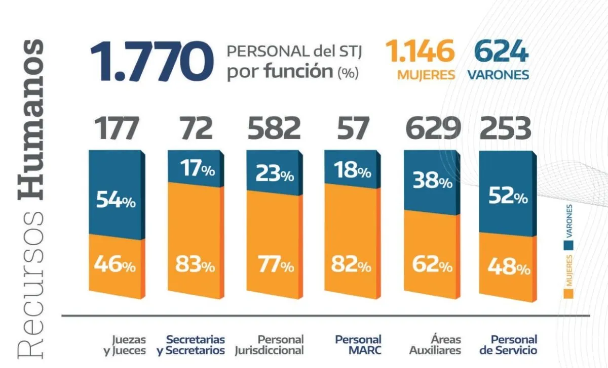 Del total de la planta que trabajan en el Poder Judicial el 68 por ciento lo hace en el ámbito del Superior Tribunal de Justicia (STJ) organismo que contiene toda la actividad jurisdiccional (tribunales, juzgados) y las áreas administrativas y auxiliares (mediación, gestión humana, investigación forense). En el Ministerio Público, que incluye fiscalía y defensa, se desempeña el 32 por restante.