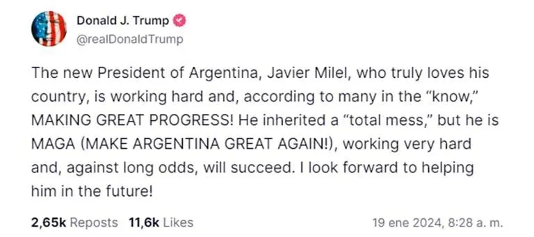 A través de su plataforma, Truth Social, le habló directamente a Milei:"¡El mundo entero está mirando! Estoy muy orgulloso de ti. ¡Torcerás el rumbo de tu país y verdaderamente harás Argentina grande nuevamente!".