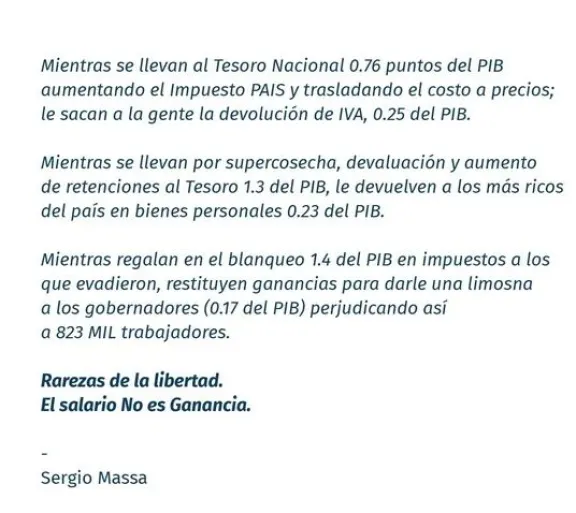 Pero las críticas de Massa no terminaron ahí. También expuso su preocupación por las políticas que benefician a los "más ricos". En particular, se refirió a la devolución de Bienes Personales, donde se estima que se le devolverá 0,23 puntos del Producto Interno Bruto (PIB) del país a los sectores más acomodados. Además, denunció que en el marco del blanqueo fiscal se otorgarán también beneficios fiscales a aquellos que evadieron impuestos, lo que representaría una pérdida de 1,4 puntos del PBI.
