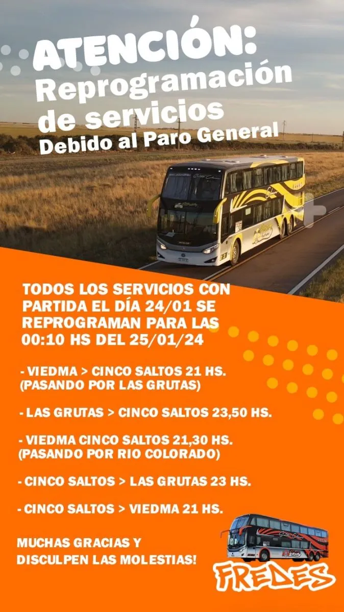 Desde Fredes, indicaron que tanto el micro que sale desde la capital rionegrina con destino a Cinco Salto, pasando por Las Grutas, y que debía salir a las 21, se reprogramó para unas horas más tardes: saldrá a las 00.10 del jueves 25. Para el mismo horario fue reprogramado el que tenía que salir de Viedma a Cinco Saltos pasando por Río Colorado a las 21.30. Ese también partirá 00.10.