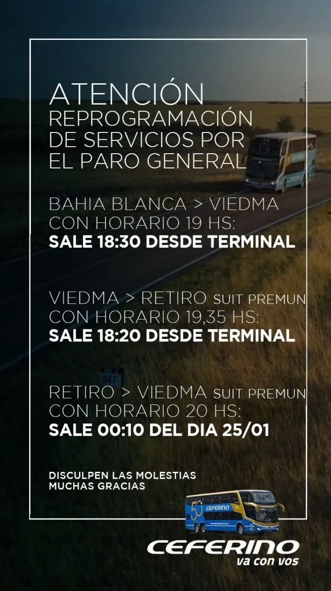 Por otro lado, desde Ceferino indicaron que el colectivo que sale desde Bahía Blanca para Viedma, cuyo horario es a las 19, se adelanta y saldrá 18.30 desde la terminal. El que va de Viedma a Retiro, no va a salir 19.35, sino que se adelanta para las 18.20. En consecuencia, el que hace Retiro-Viedma no saldrá a las 20, sino que 00.10.