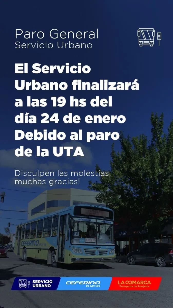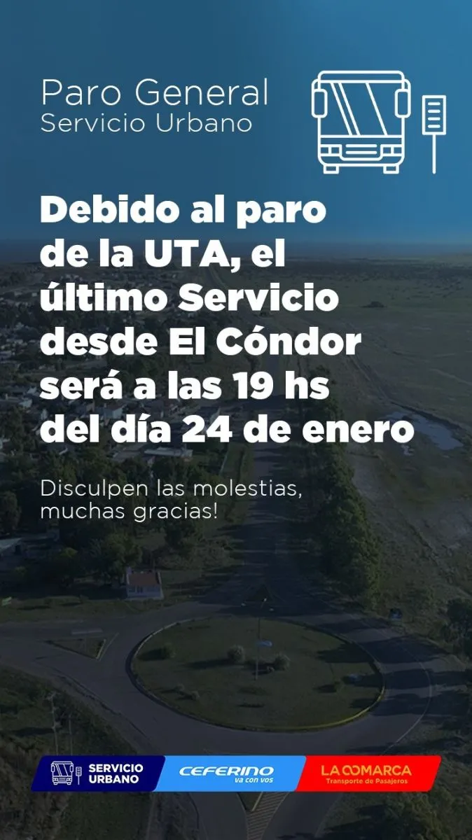 Ya hablando del transporte local, por este miércoles 24, el último servicio que saldrá desde El Cóndor a Viedma será a las 19. En cuanto el servicio urbano, funcionará normal hasta las 19, horario en el que se suman al paro nacional.