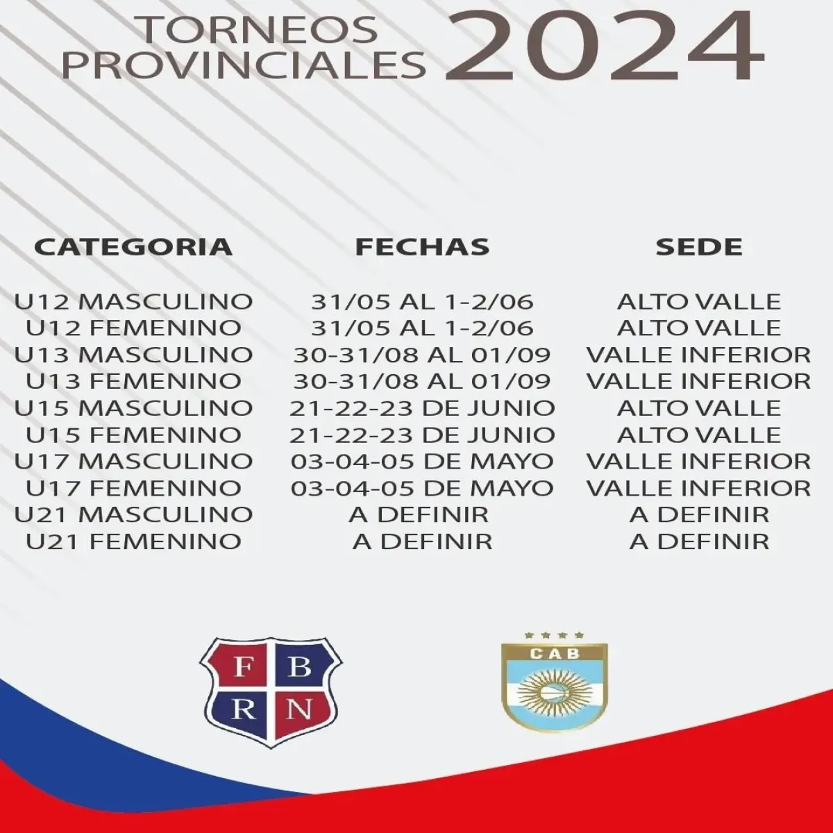 El primer evento que se avecina será el U17 (tanto femenino como masculino) que se disputará del 3 al 5 de mayo, con sede en el Valle Inferior de Río Negro. La competencia U12, tendrá lugar los últimos dísa de ese mismo mes y los primeros de junio, desarrollándose en el Alto Valle. El Campeonato U15 se disputará también en el Alto Valle rionegrino los días 21, 22 y 23 de junio, mientras que el 30, 31 de agosto y 1° de septiembre se desarrollará en el Valle Inferior el campeonato U13.
