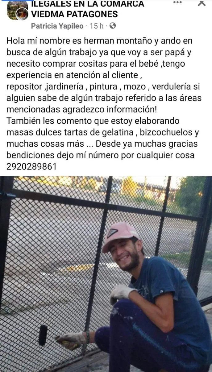 Vía Facebook, se presentó así: "Hola, mi nombre es Hernán Montaño y ando en busca de algún trabajo, ya que voy a ser papá y necesito comprar cositas para el bebé. Tengo experiencia en atención al cliente, repositor, jardinería, pintura, mozo y verdulería, si alguien sabe de algún trabajo referido a las áreas mencionadas agradezco información".