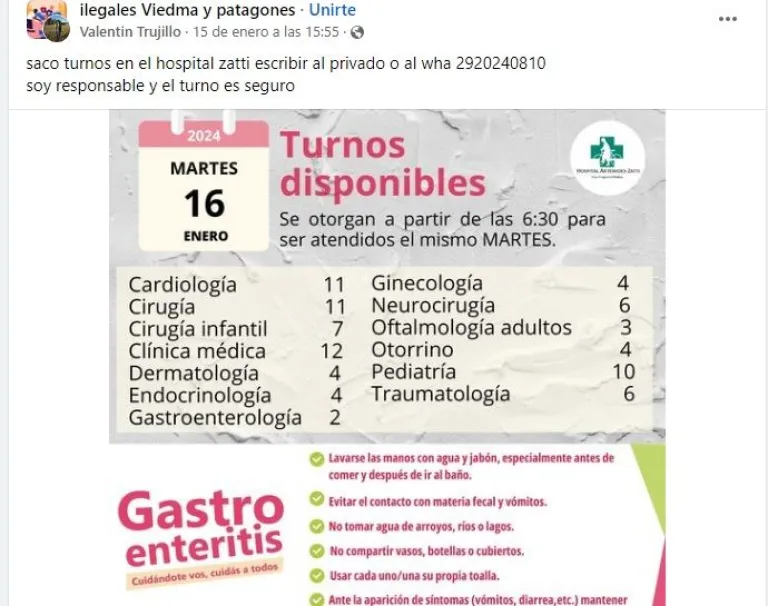 Desde el Hospital Zatti se comunicó una gacetilla donde apelan a los vecinos a colaborar con erradircarlos. “La entrega de turnos es nominal y requiere la presentación del DNI en persona, por lo que instamos a la población a no utilizar los servicios ofrecidos por estas personas”, manifestaron.