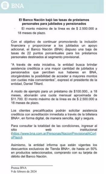 Esta medida implica una disminución de 22 puntos porcentuales en las tasas y establece un límite máximo de préstamo de $2.500.000 a pagar en un plazo de 18 meses. De esta manera, el BNA busca proporcionar asistencia crediticia a una mayor cantidad de jubilados y pensionados que cobran sus haberes en la entidad bancaria.