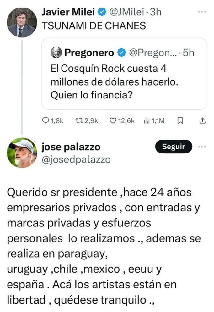 José Palazzo, prestigioso productor del mega evento musical, aclaró y dejo en evidencia la ignorancia del primer mandatario, respondiendo en la misma red social y llevando tranquilidad  y transparencia para las suspicacias a quienes tanto se preocupan por el financiamiento de estos festivales privados.