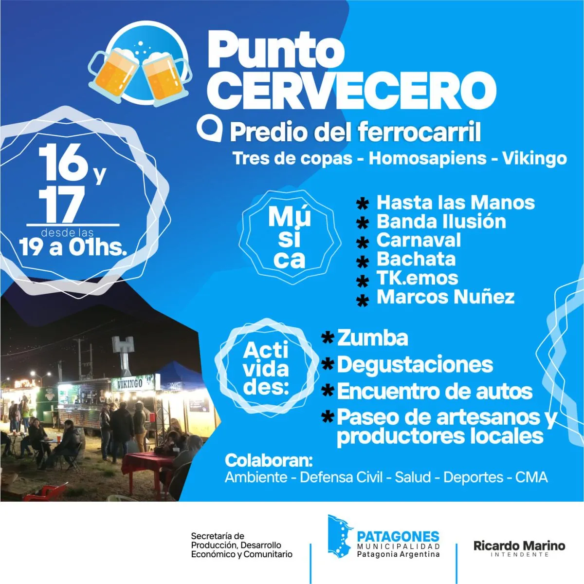 Desde el distrito Patagones se promueve este impulso, atendiendo la demanda y promoción de venta. Los protagonistas de la jornada serán los cerveceros locales: Tres de copas; Homosapiens y Vikingo. Será una gran oportunidad de disfrutar de buena música, degustaciones y acompañar a los productores locales.
