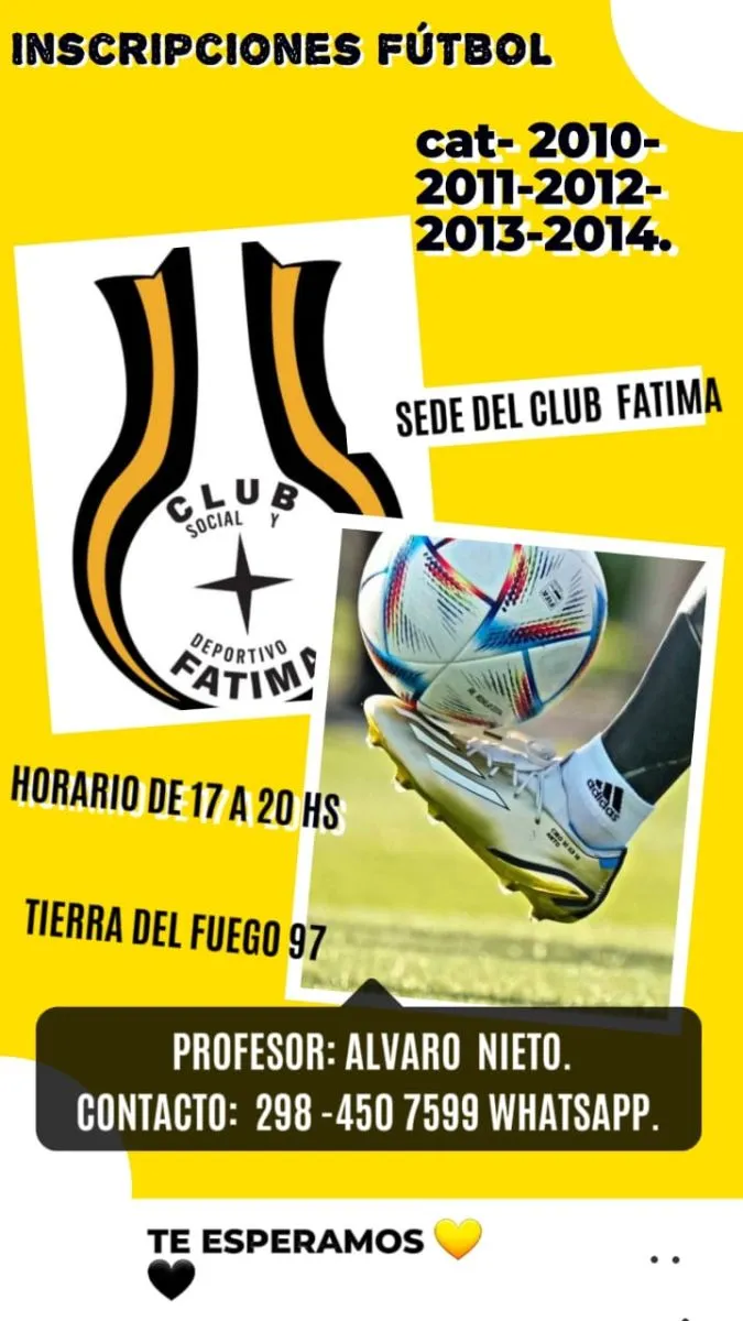 El Club Fátima apunta a un histórico 2024, donde se ha confirmado el regreso del fútbol a la Liga Rionegrina y la posibilidad de poder trabajar en un predio para albergar a la categoría. Esto sumado a que han podido finalizar su sede de 300 metros cuadrados donde se alojan las disciplinas de Gimnasia Artística, Patín y Vóley.