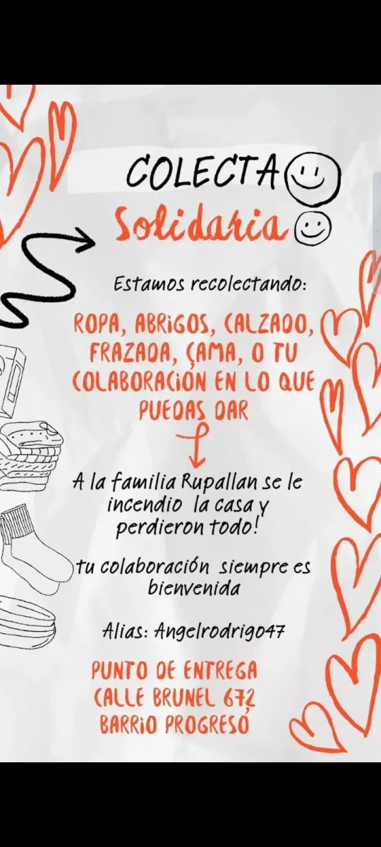 A raíz de lo ocurrido se inició una campaña solidaria para ayudar a la familia damnificada, por lo que se pide ropa de abrigo, frazadas, camas, mesa y sillas. Las donaciones pueden acercarse al domicilio ubicado en calle Brunel 672, del barrio El Progreso.