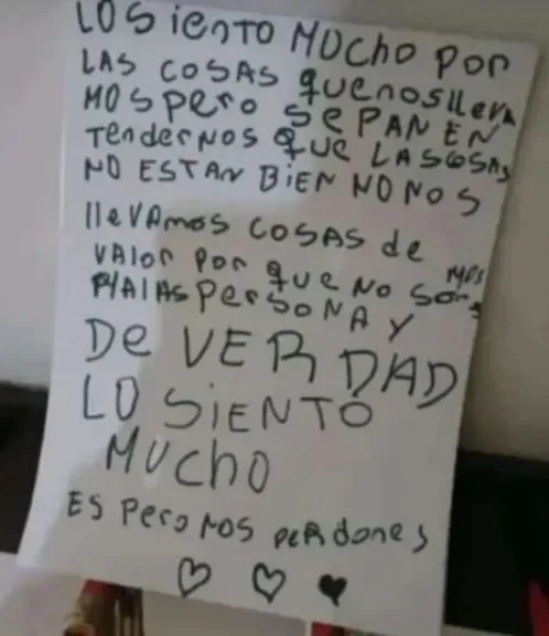 Las autoridades de Santiago del Estero se encuentran investigando un robo perpetrado en el Jardín de Infantes N° 146 "Los Changuitos". Los miembros de una banda dejaron una nota en la cual pedían disculpas y pedían comprensión señalando que "las cosas no están bien". A pesar de considerar que solo se llevaron objetos sin valor, se llevaron cartucheras de los chicos, una notebook, un parlante, una pava eléctrica y un pendrive con música y alimentos.