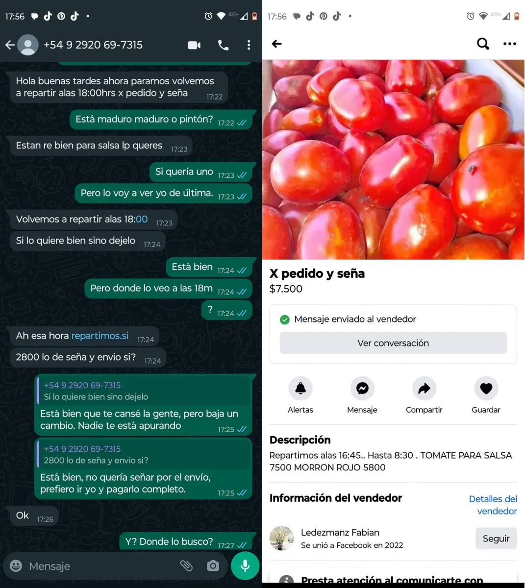 En las capturas se lee como el malhechor intentaba por todos los medios que le anticiparon parte del pago por el producto prometido, que en el caso principal fue un cajón de tomates.