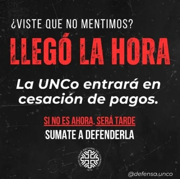 “POR FAVOR, NO MIREMOS PARA OTRO LADO. NO SEAMOS PARTE DE LA GENERACIÓN QUE DEJE MORIR A LA UNIVERSIDAD PÚBLICA”, expresan mediante un comunicado desde la Defendamos la Unco, una agrupación conformado por estudiantes, docentes y no docentes