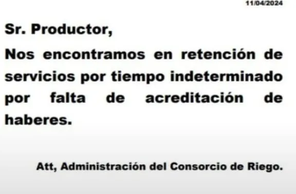 El Consorcio de Riego del Instituto de Desarrollo del Valle Inferior (IDEVI) se encuentra en retención de servicios y los productores están de capa caída, ya que no tienen la posibilidad de regar sus hectáreas.